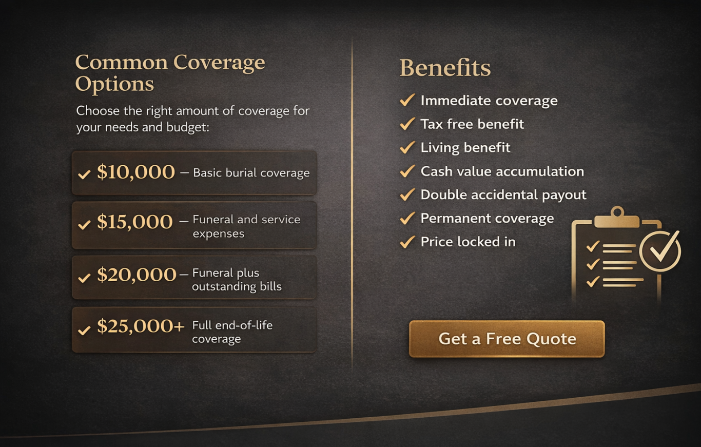 Helping families plan for the future is something we are deeply serious and committed about. Final expense coverage can relieve loved ones of unexpected financial stress during one of the most difficult moments in life, and being able to provide that peace of mind is what motivates us to continue in this industry.